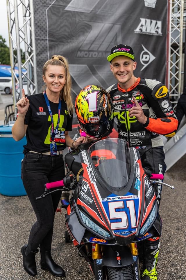 Kaleb De Keyrel (pictured with his then-girlfriend and now-wife Marissa) celebrates his Twins Cup Championship aboard the Aprilia RS 660 in 2021. Photo courtesy of Kaleb De Keyrel.