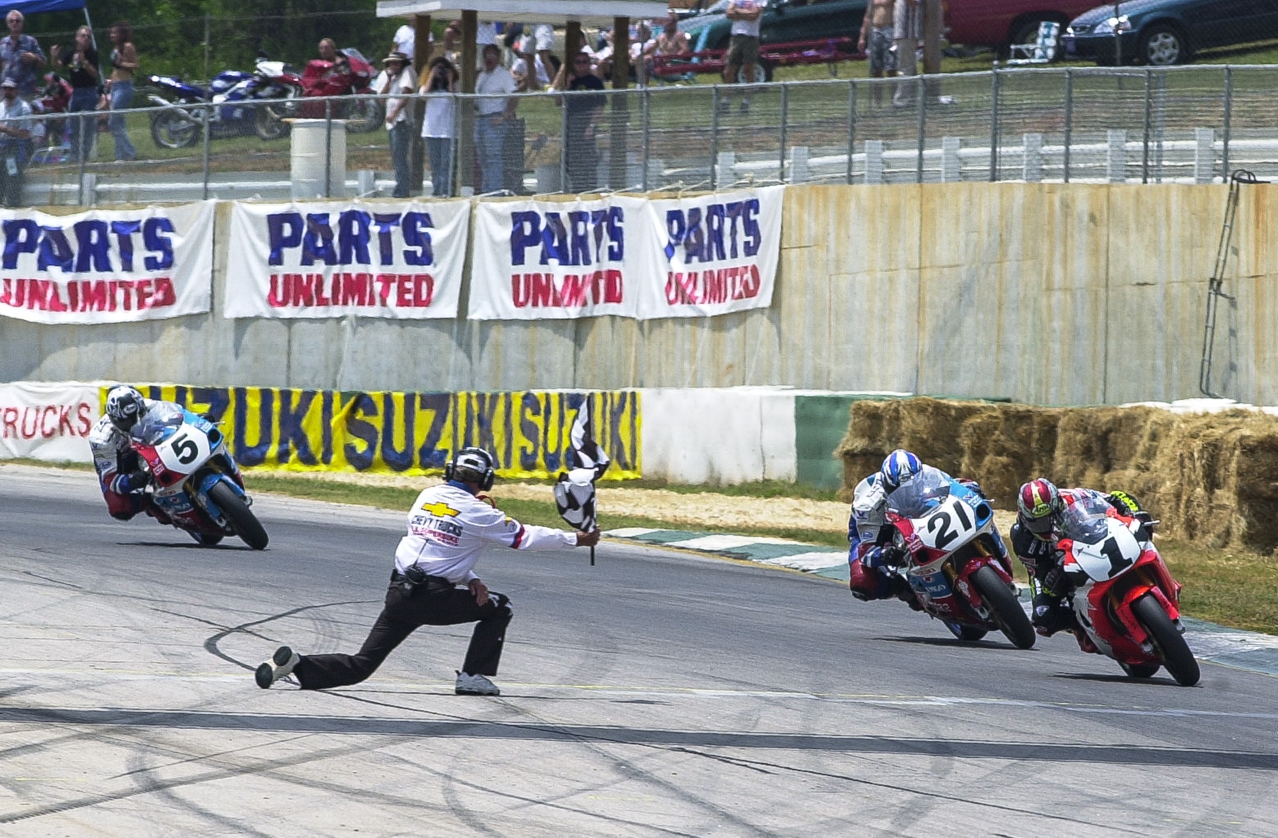 Eighty-four-year-old Bobby Lemming and his son David Lemming are bona fide AMA flag-waving legends. Both men previously worked as race starters for AMA road racing, and Bobby has appeared in many a finish-line photo. He was familiar to everyone because of his lanky frame and also his trademark outstretched leg and right arm pose with the checkered flag billowing from his right hand.