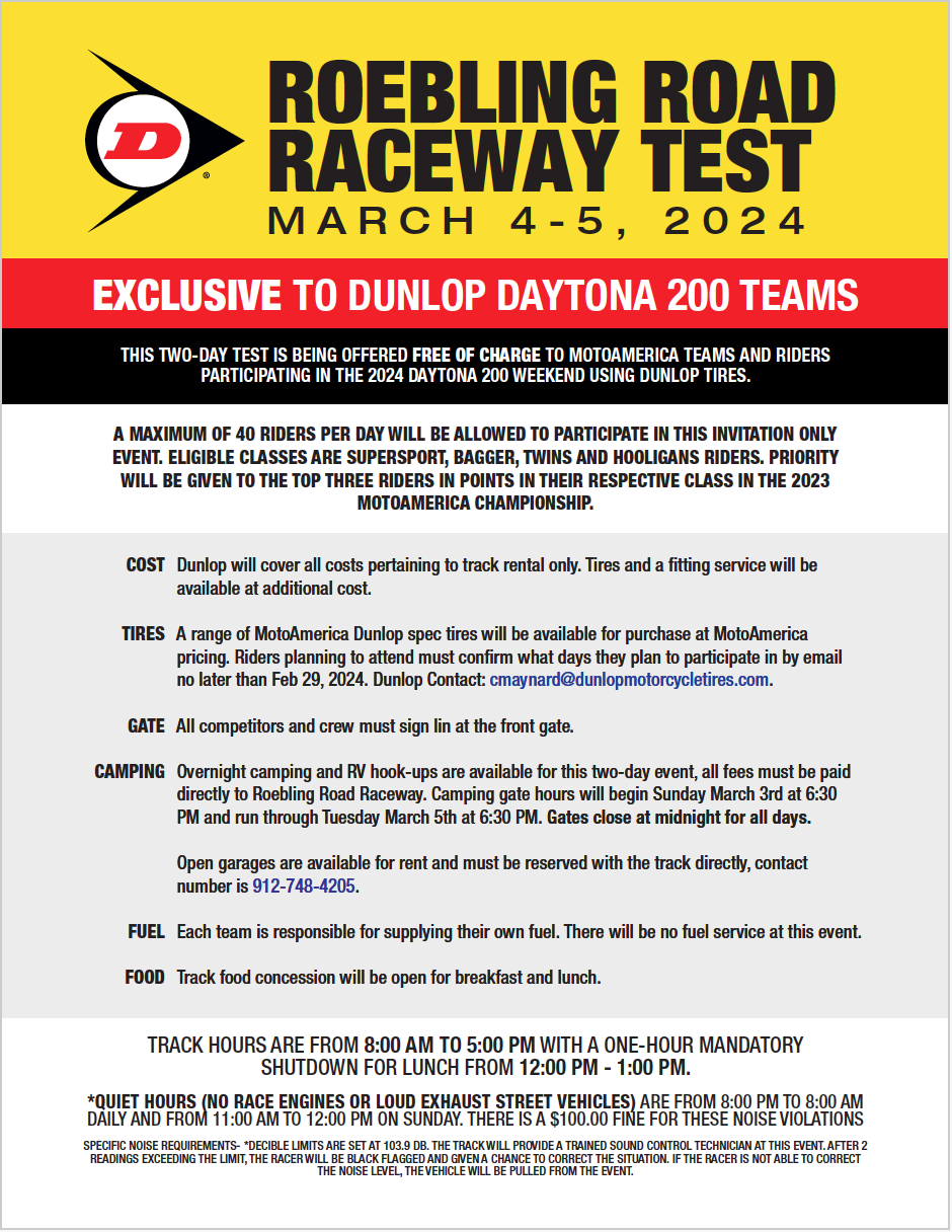 Dunlop Motorcycle Tires is inviting teams and riders competing at Daytona to participate in a two-day tire test on March 4 and 5 at Roebling Road Raceway, near Savannah, Georgia, just prior to the MotoAmerica event at Daytona International Speedway on March 7 through 9.