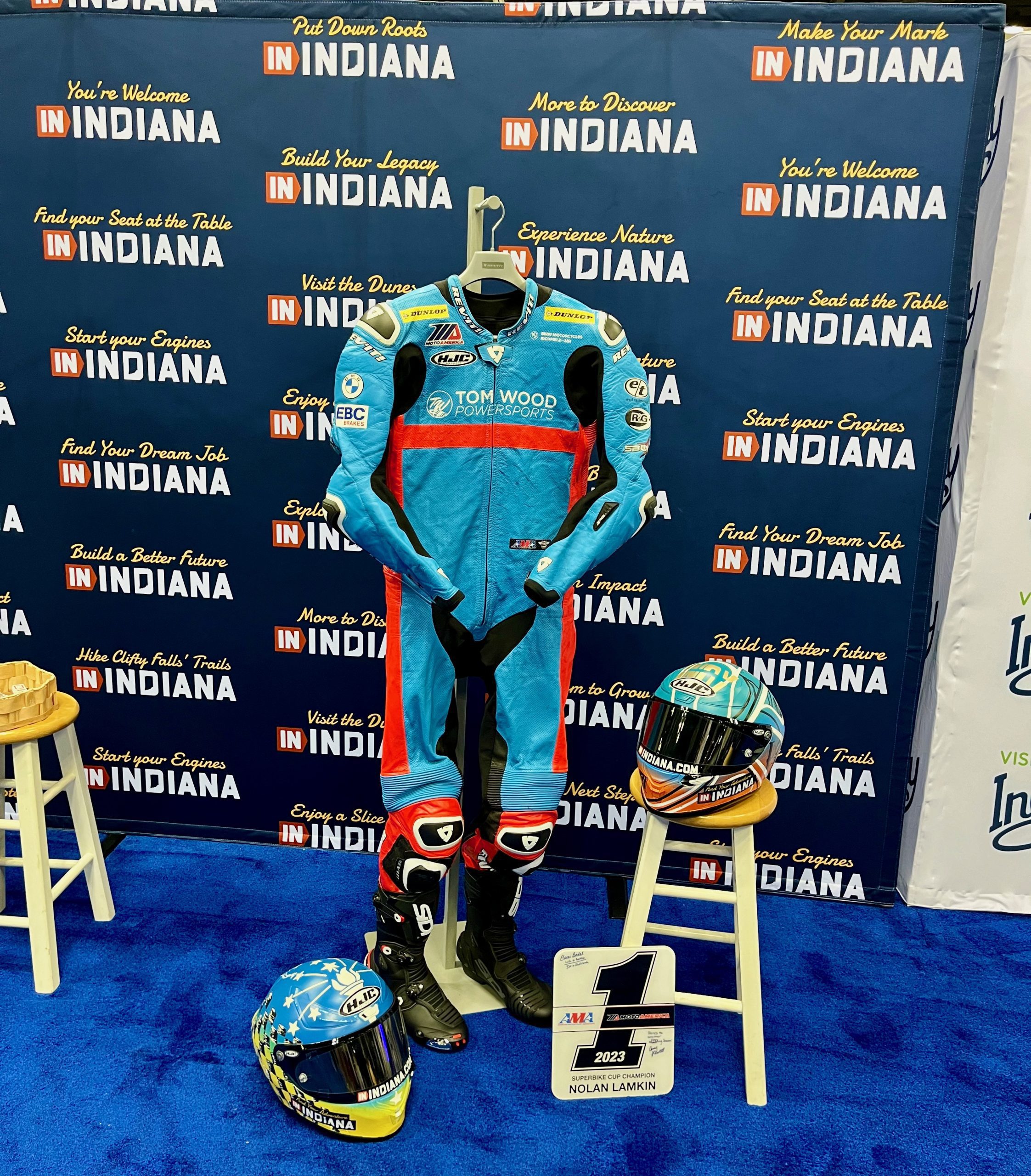 As part of Lamkin’s sponsorship relationship with the State of Indiana (IN Indiana), he was given the opportunity to participate in a special motorsports-specific display at NBA Crossover in the Indiana Convention Center. Lamkin’s road racing safety gear, which included his leather suit adorned with a Tom Wood Powersports logo representing his main sponsor, plus two of his helmets that were custom-painted with IN Indiana graphics, and of course, his AMA #1 Superbike Cup Championship plate were on display throughout the weekend.