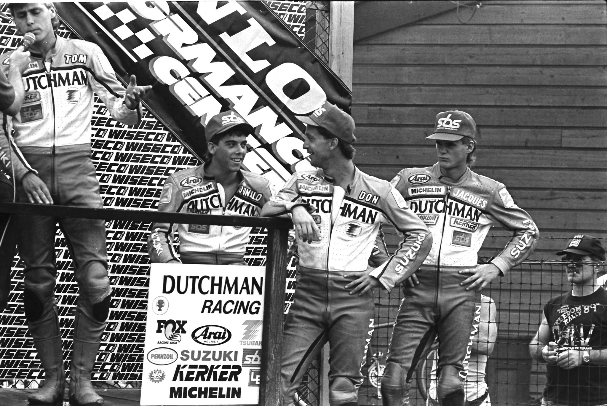 Greene, shown here with his right elbow on the railing, helped win the 1990 AMA Endurance race at Mid-Ohio with his teammates Tom Kipp (left), Donald Jacks (second from left), and Jacques Guenette Jr. (to the right of Greene). Photo courtesy of Larry Lawrence/The Rider Files.