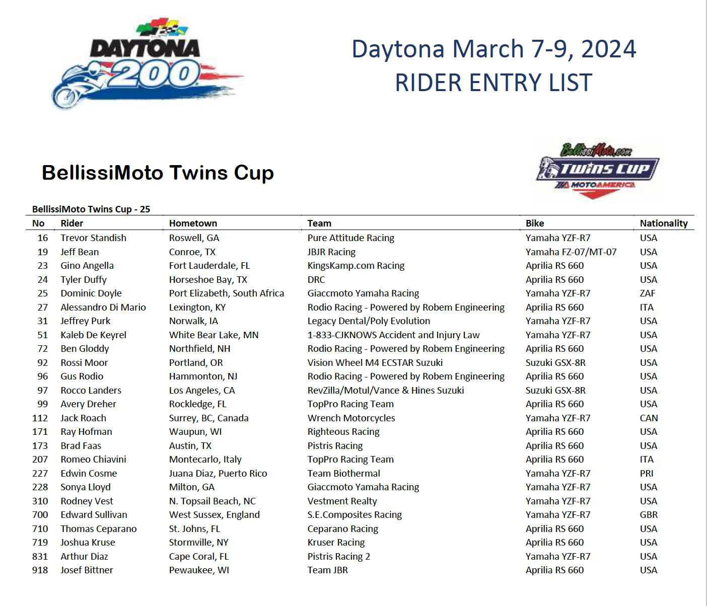 About the aforementioned Aprilia, Rodio Racing is back for 2024, and they’ll once again be powered by Robem Engineering with odds-on-favorite-to-win-the-championship Gus Rodio teamed up with Italian-by-way-of-Kentucky rider Alessandro Di Mario and wild-card New Hampshirite Ben Gloddy returning to the team for Daytona at least (and maybe more?). And, speaking of Italy, new team TopPro Racing has brought in Romeo Chiavini to pilot an Aprilia. Those four will be joined by eight more Ape-riders ready to go “660” on the field of 25.