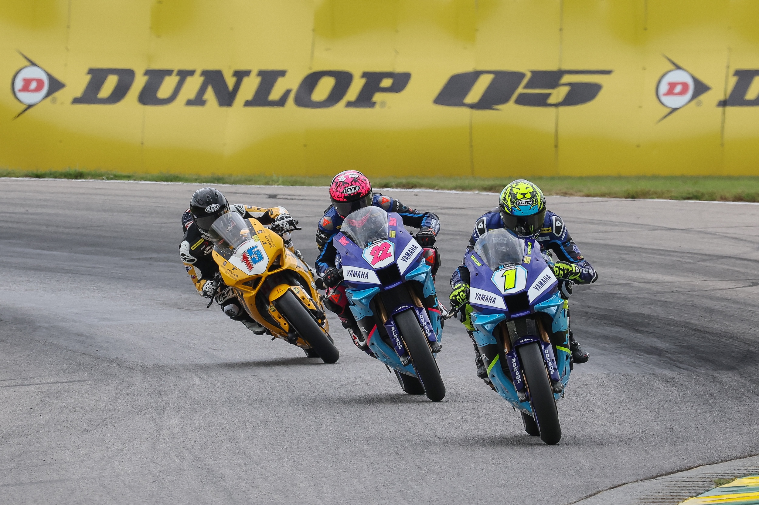 Mathew Scholtz (1) leads his teammate Blake Davis (22) and PJ Jacobsen (15) in the second of two Supersport races at VIRginia International Raceway on Sunday. Scholtz swept the doubleheader with a second win on Sunday. Photo by Brian J. Nelson