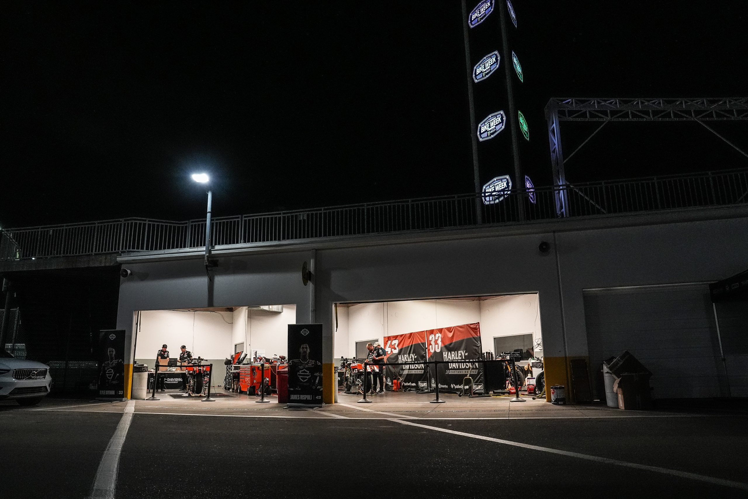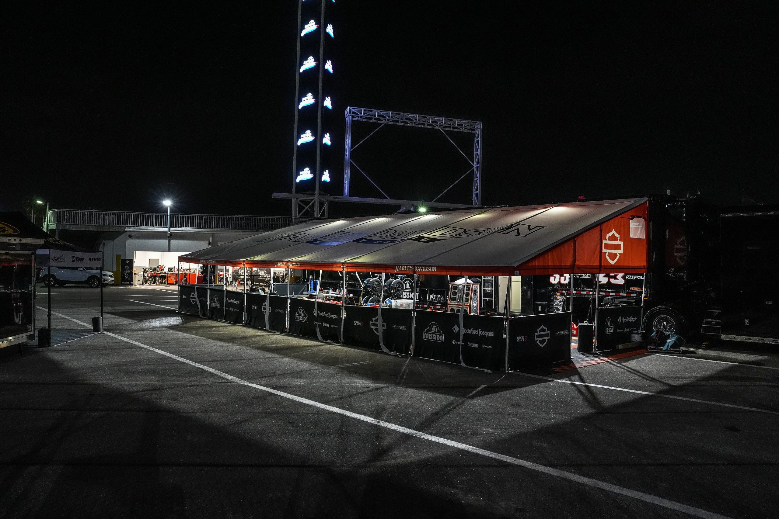 Like moths to a flame, a select group of Harley-Davidson personnel was drawn to the Factory Racing team’s illuminated canopy and transporter. They say nothing good happens in the world at three o’clock in the morning, but I beg to differ. On Thursday night into Friday morning two weeks ago at Daytona International Speedway, some very good things happened. The best of things, in fact. To find out what went on, I talked to one of the men who was there, Jason Kehl, Harley-Davidson Director of Racing. Here’s the interview:
