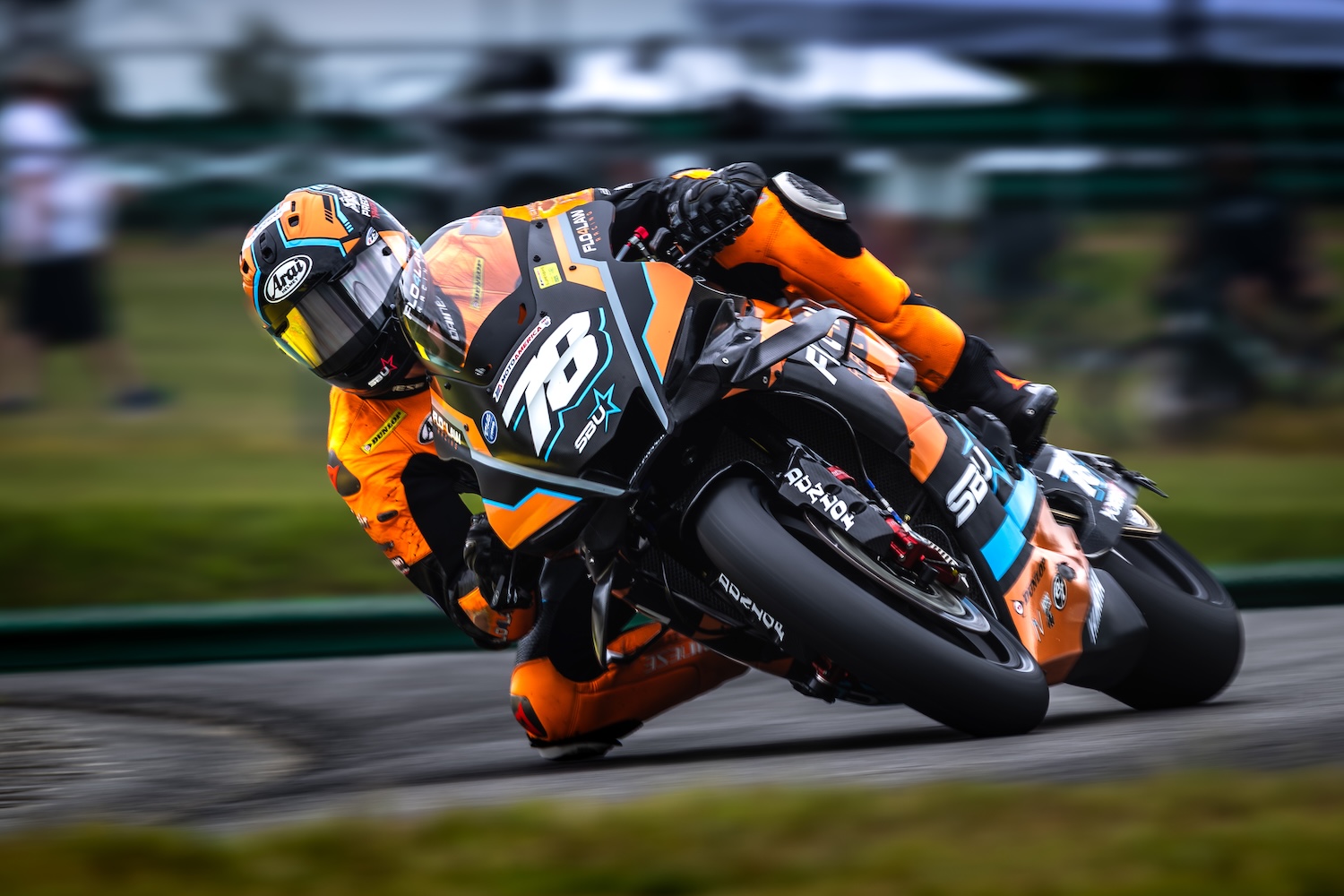 Saturday afternoon’s Race 1 saw both OrangeCat Racing riders a little off the race-leading pace. Lee finished Lap 1 in third place, but a mistake on Lap 2 dropped him to fifth in the running order. Uribe had moved up to fourth place by the end of the first lap, and Uribe and Lee finished the race in fourth and fifth place, respectively.
